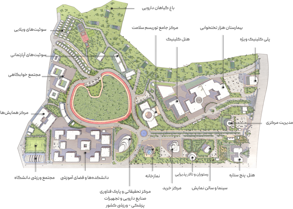 نمایی کلی از مجموعهای یکپارچه شامل بیمارستان، دانشگاه علوم پزشکی، مراکز اقامتی، فضاهای سبز و مراکز نوآوری سلامت.