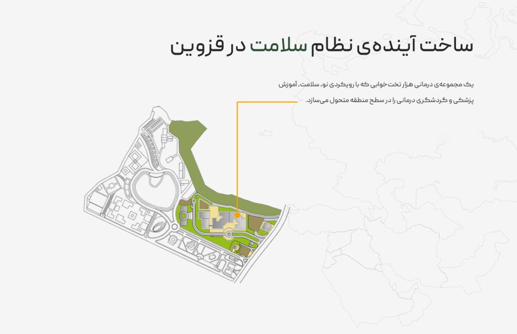 این پروژه در زمینی به مساحت ۱۰۰ هکتار در منطقه‌ی باراجین قزوین احداث می‌شود و با ترکیب درمان، آموزش، پژوهش و گردشگری در قالب یک چشم‌انداز واحد، الگویی نوین برای شهرهای سلامت چندمنظوره در خاورمیانه ایجاد خواهد کرد.
